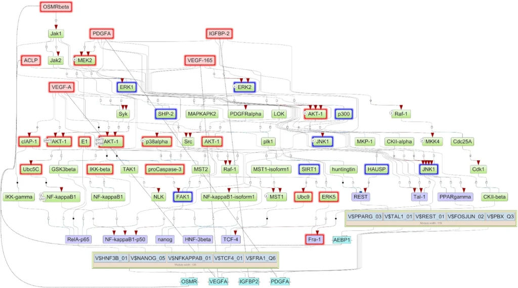 Using Genome Enhancer, geneXplain’s multi-omics analysis platform, our team uncovered the key molecular “conductors” that orchestrate these loops — the master regulators that determine whether a glioblastoma remains under control or becomes unstoppable. Among them, IGFBP2, VEGFA, PDGFA, AEBP1, and OSMR stand out as the central hubs of this self-sustaining system. These molecules form positive feedback loops that continually reactivate their own signaling networks — a biochemical echo chamber that fuels tumor invasion, therapy resistance, and relapse.