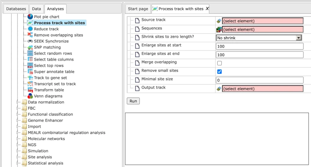 The geneXplain platform provides you with an option to modify these track files. “Process track with Sites” is a function which enables the user to enlarge/shrink sites on the track, merge overlapping sites or remove too short sites. For example an already saved track in the repository can be processed by adding sequences from Ensembl or some other database.