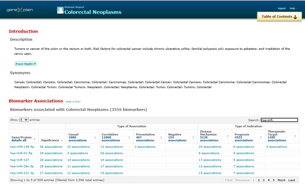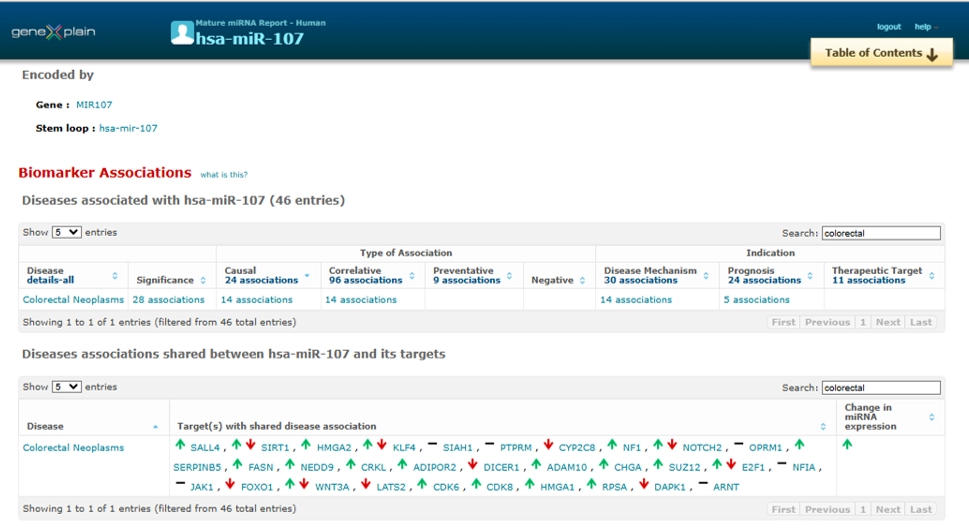 Example: Colorectal Neoplasm ReportIn the Disease Report for Colorectal Neoplasm, TRANSFAC® lists associated miRNAs (e.g., hsa-miR-107) and their relationship to TFs and other targets — annotated with their disease relevance.